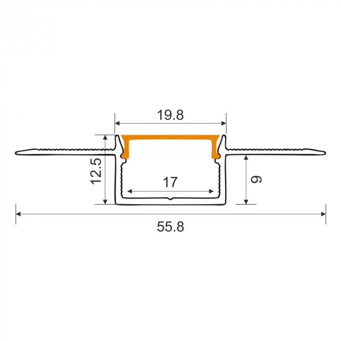 EcoLight Gipszkartonba süllyeszthető aluprofil 17 mm széles 2 méteres szál opál fedővel
