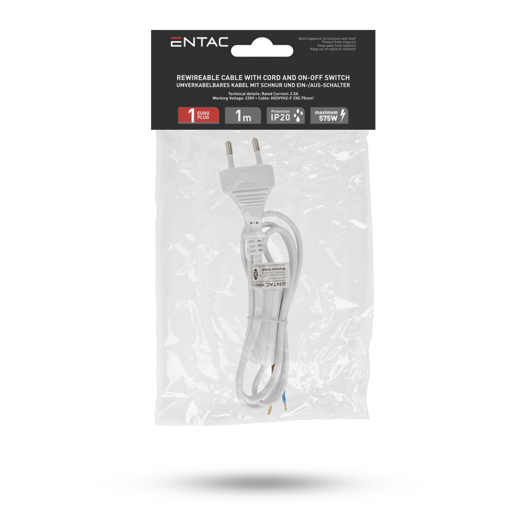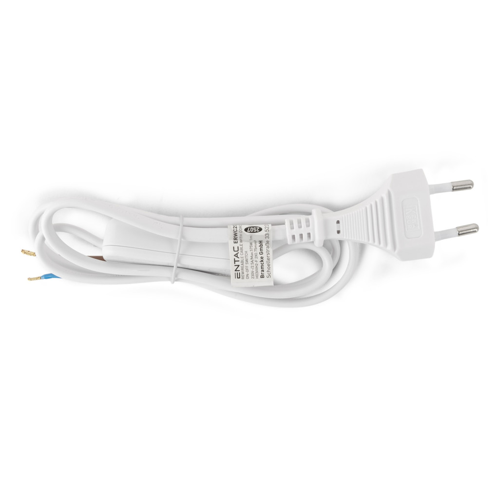 Entac Szerelhető hálózati kábel 2G0.75 100cm, Kétállású kapcsolóval, Fehér