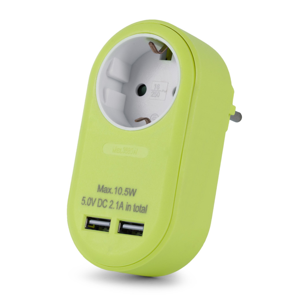 Entac Hálózati Adapter 1 Földelt Aljzat és 2 USB (össz. 2.1A) Lime
